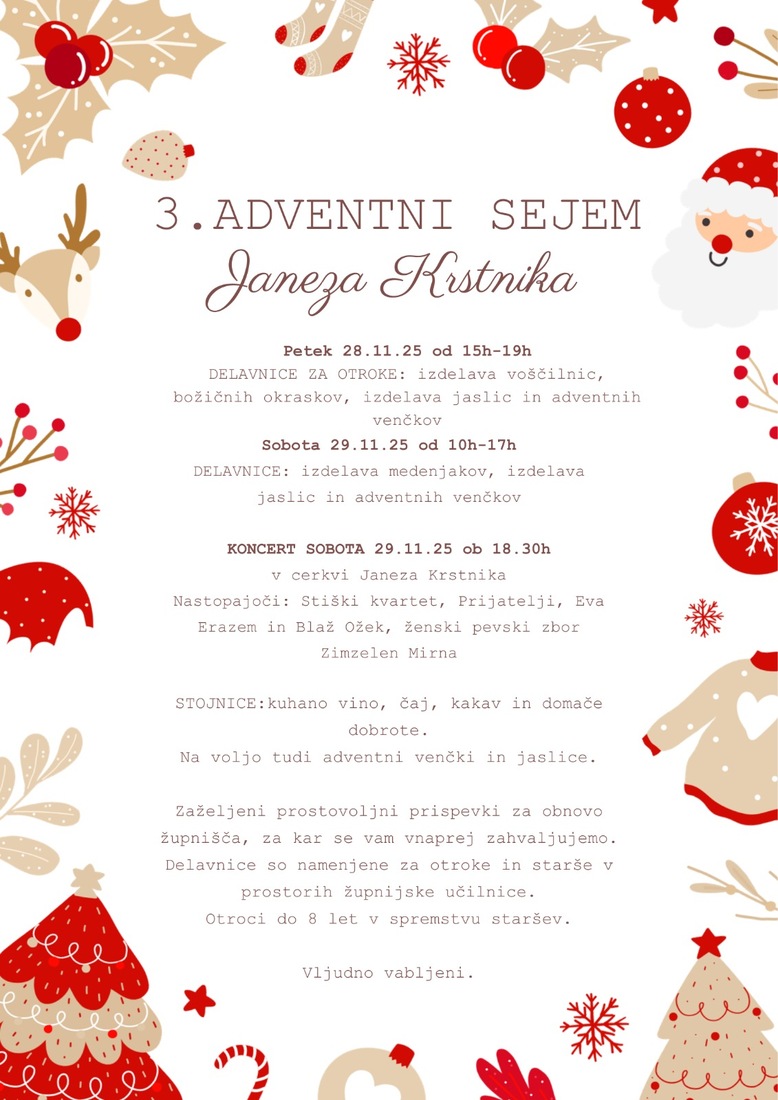Oba dneva stojnice s kuhanim vinom, čajem, kakavom in domačimi dobrotami. Na voljo bodo tudi adventni venčki in jaslice.