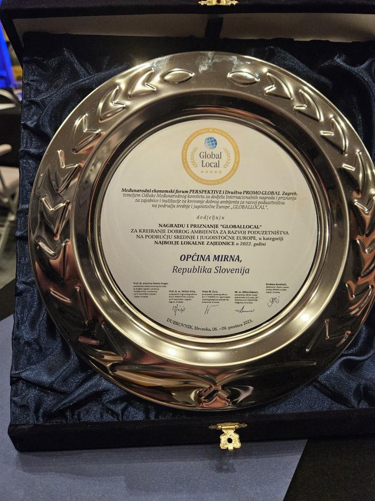 Občina Mirna je včeraj v Dubrovniku prejela mednarodno nagrado za ustvarjanje dobrih pogojev za razvoj gospodarstva in podjetništva za leto 2022 GLOBALLOCAL. Nagrado je prevzel župan Dušan Skerbiš.
