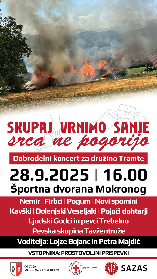 V nedeljo, 28. septembra 2025, ob 16.00 uri se bo v Športni dvorani Mokronog odvijal dobrodelni koncert, katerega cilj je pomoč družini Tramte, ki je zaradi nedavnega požara utrpela hudo materialno škodo. Zgorelo jim je celotno gospodarsko poslopje s hlevom in delovnimi stroji, kar jih je postavilo v izjemno stisko.