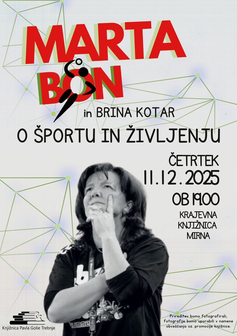 "Martine kolumne – tako kot njeno življenje – so živahna tapiserija duhovnosti, modrosti in nefiltrirane iskrenosti. Ne glede na to ali osvetljuje svoje trenerstvo, akademsko kariero, dinamiko spolov ali vlogo športa v družbi, njeno pisanje odraža njeno osebnost: živahno, nekonvencionalno in neustavljivo neposredno. Marte se ne da popredalčkati: je učenjakinja, je športnica, je upornica, je nenavadna pripovedovalka zgodb. Je dejstvo, da živi vsako besedo, ki jo napiše", je v knjigi zapisala urednica Brina Kotar, ki bo usmerjala pogovor v Krajevni knjižnici Mirna.