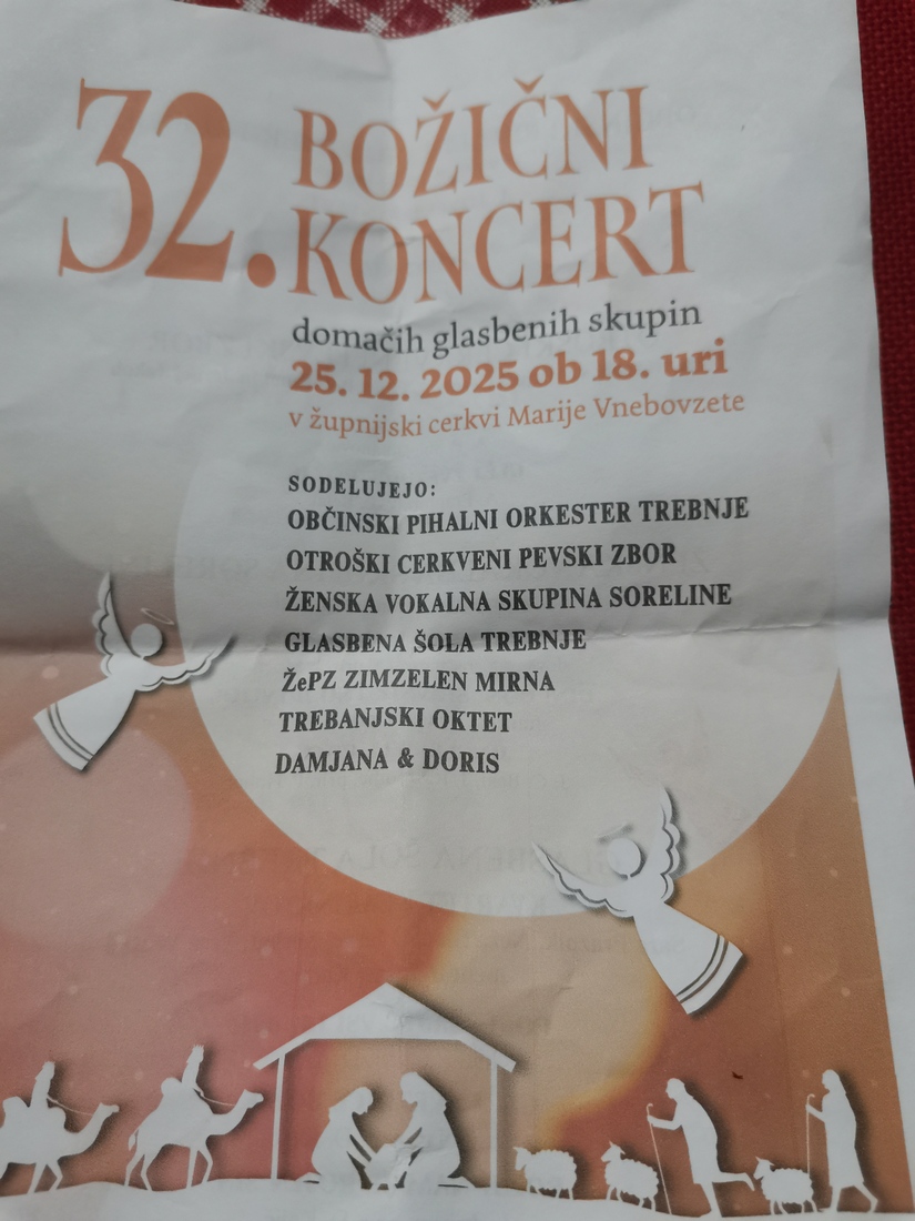 Uvodnemu nastopu Občinskega pihalnega orkestra Trebnje pod vodstvom Jerneja Korbarja so sledili nastopi otroškega cerkvenega pevskega zbora, ženske vokalne skupine Soreline, Kvarteta klarinetov Glasbene šole Trebnje, ŽePZ Zimzelen Mirna, Trebanjskega okteta in dueta Damjana&Doris.