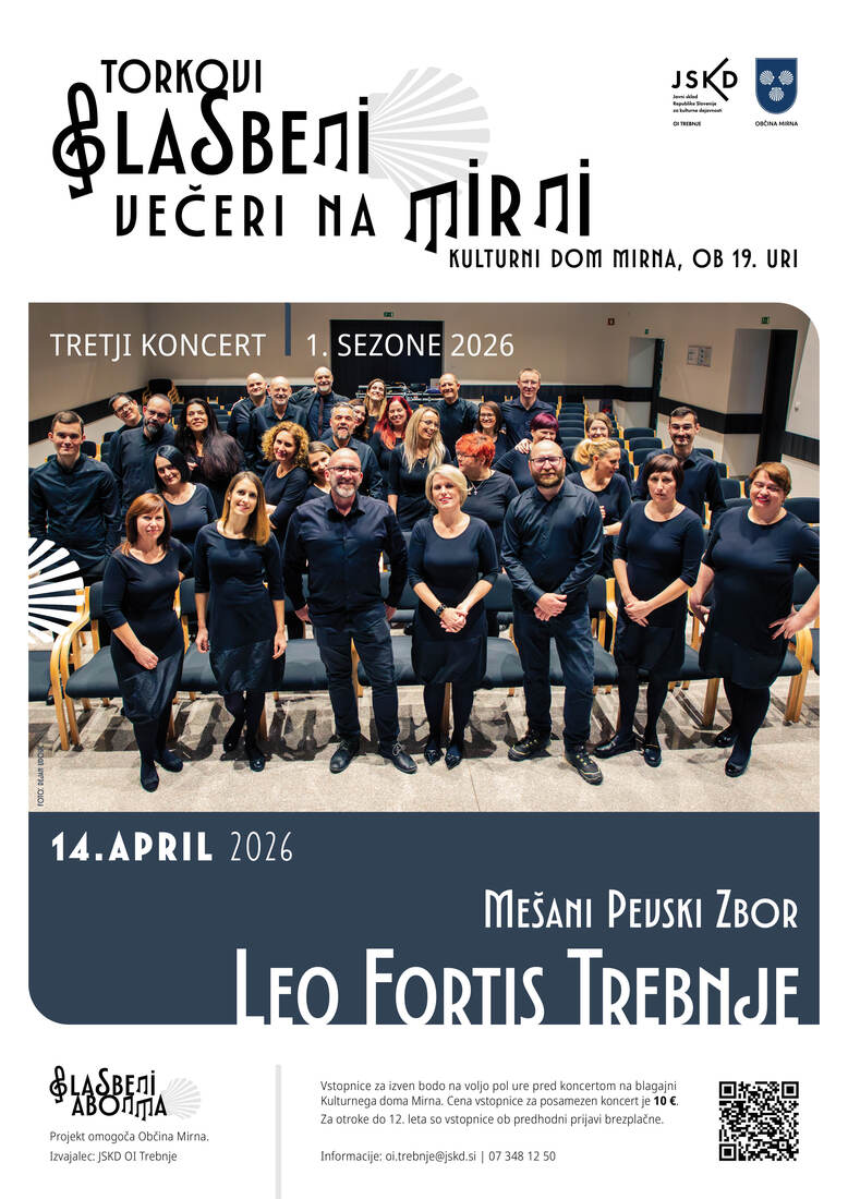 V torek, 14. aprila 2026, vas ob 19. uri vabimo v Kulturni dom Mirna na koncert MePZ Leo Fortis Trebnje.